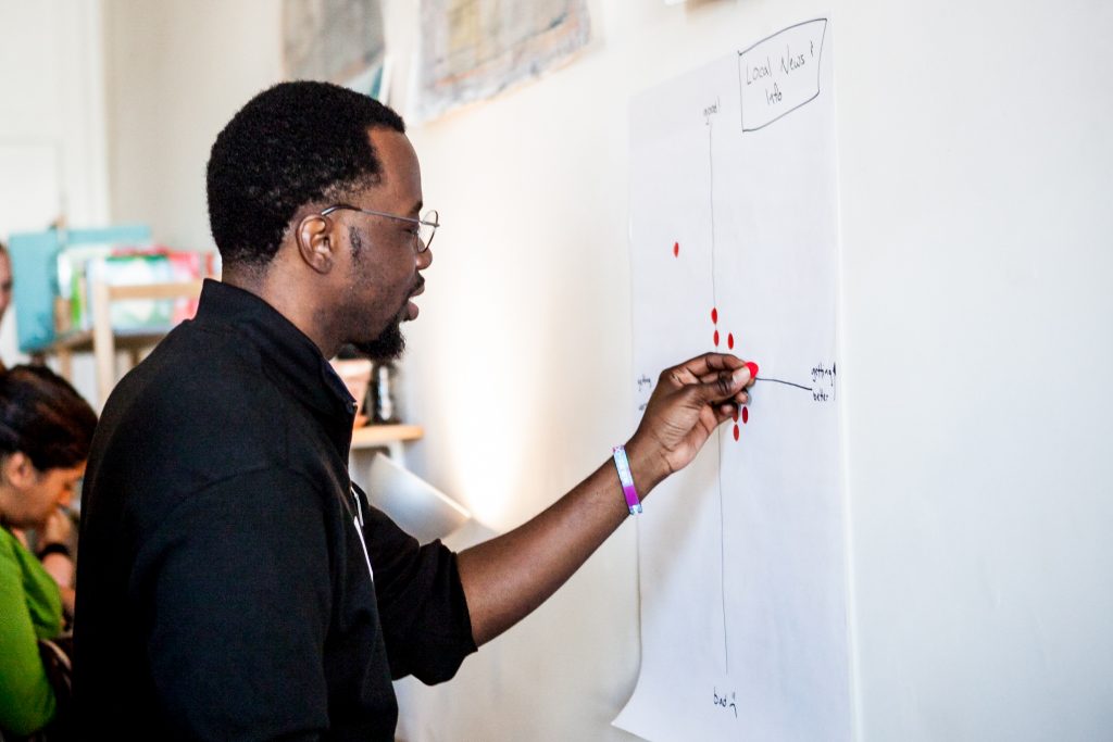 Democracy Fund has been spending the past year learning from and listening to local journalists, civic leaders, and foundations. A participant at a small collaborative workshop in New Orleans takes part in that process. Photo by Claire Bangser/Roots and Wings Creative